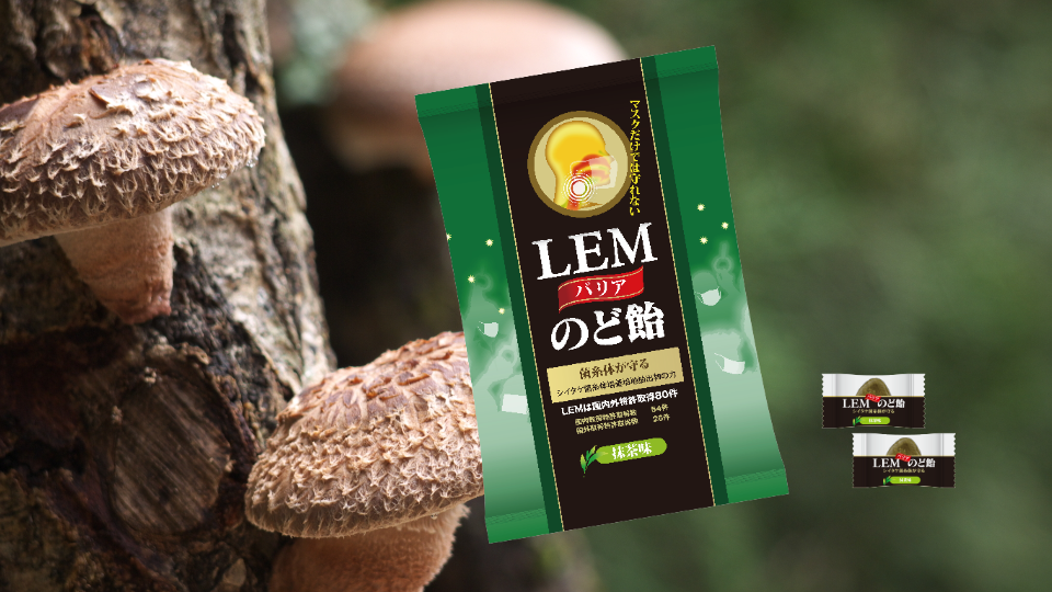 シイタケ菌糸体エキス**を使用した「インフルブロック LEMバリアのど飴」は、うがいと同様のバリア効果を持ち、外出先でも安心してお使いいただけます。人ごみや閉鎖された空間でも、あなたの喉をしっかりガード!